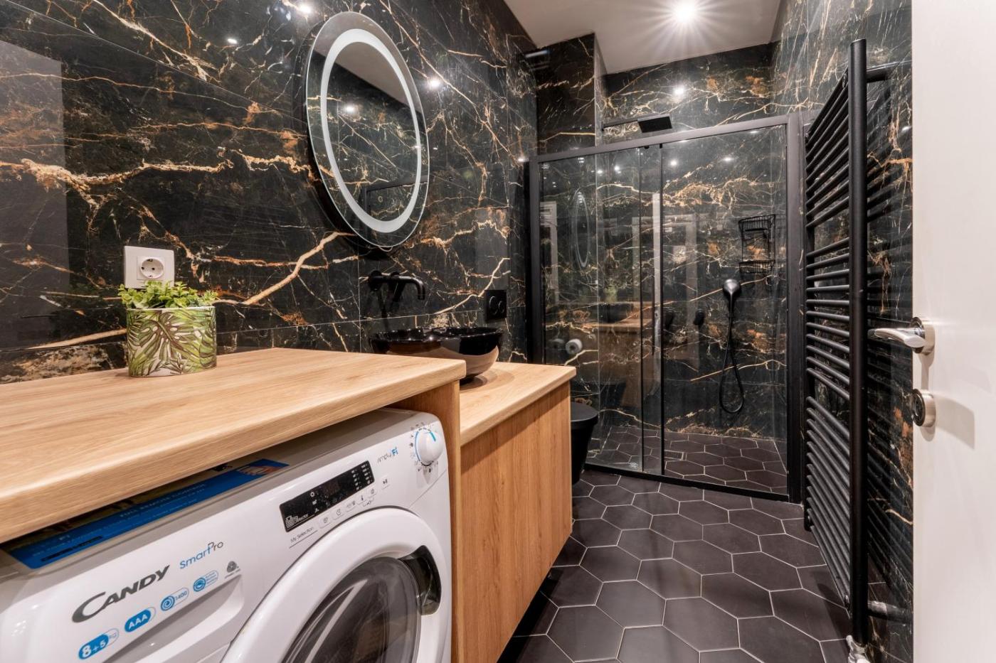Deluxe Apartment. Featuring a private entrance, this air-conditioned apartment consists of 1 living room, 1 separate bedroom and 1 bathroom with a walk-in shower and a hairdryer. In the well-fitted kitchen, guests will find a stovetop, a refrigerator, kitchenware and an oven. Boasting a terrace with city views, this apartment also provides a washing machine and a flat-screen TV with cable channels. The unit offers 2 beds.
