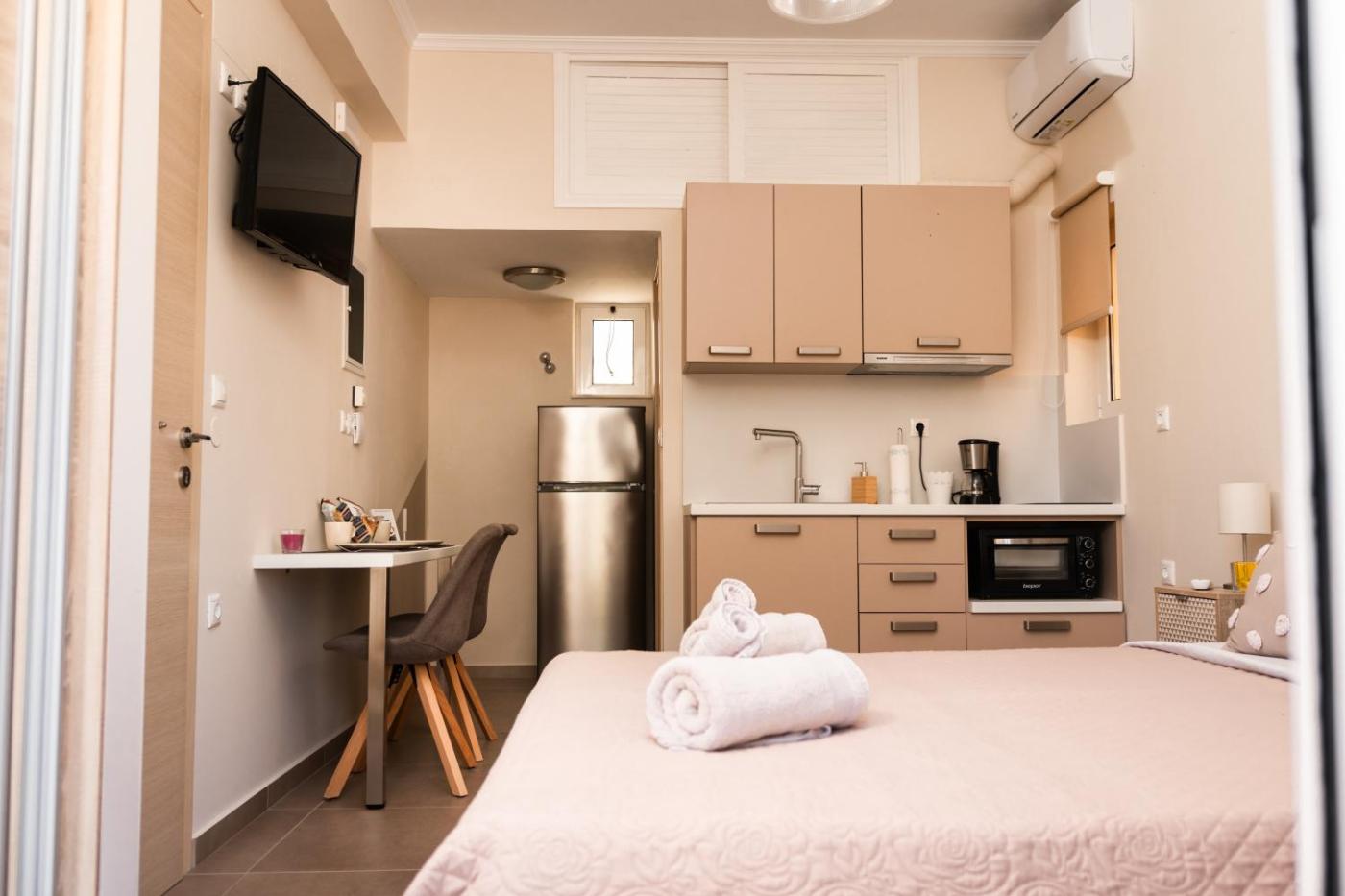 Studio Apartment. Boasting a private entrance, this air-conditioned apartment includes a kitchen, 1 bedroom and 1 bathroom with a shower and a hairdryer. Guests can make meals in the kitchen that has a stovetop, a refrigerator, kitchenware and an oven. Featuring a terrace with garden views, this apartment also offers a washing machine and a flat-screen TV. The unit has 1 bed. ;