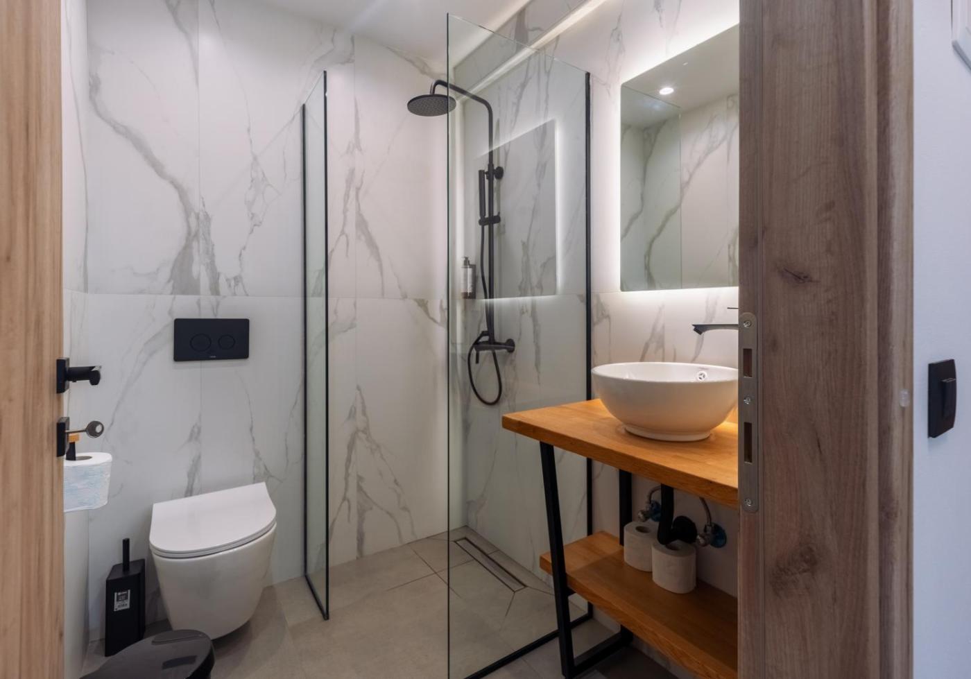One-Bedroom Apartment with Balcony and Mountain View. The air-conditioned apartment features 1 bedroom and 1 bathroom with a walk-in shower and a hairdryer. Guests can make meals in the fully equipped kitchenette that has a stovetop, a refrigerator and kitchenware. Featuring a terrace with sea views, this apartment also provides a tea and coffee maker and a flat-screen TV. The unit offers 2 beds. ;