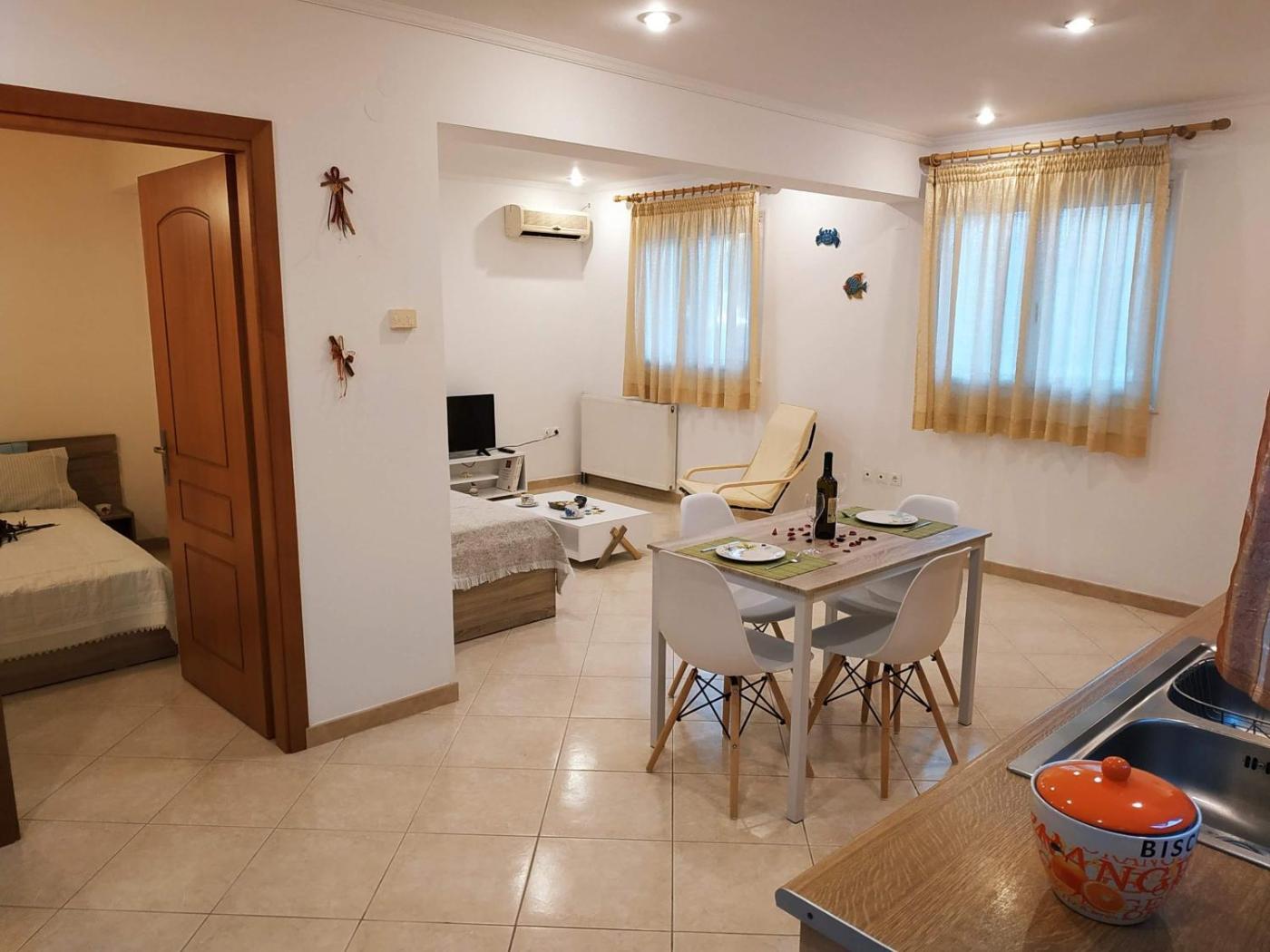 One-Bedroom Apartment. This air-conditioned apartment comes with 1 living room, 1 separate bedroom and 1 bathroom with a bath. Meals can be prepared in the well-fitted kitchen, which features a stovetop, a refrigerator, kitchenware and an oven. Boasting a balcony, this apartment also features a washing machine, a tea and coffee maker and a flat-screen TV. The unit has 3 beds. ;