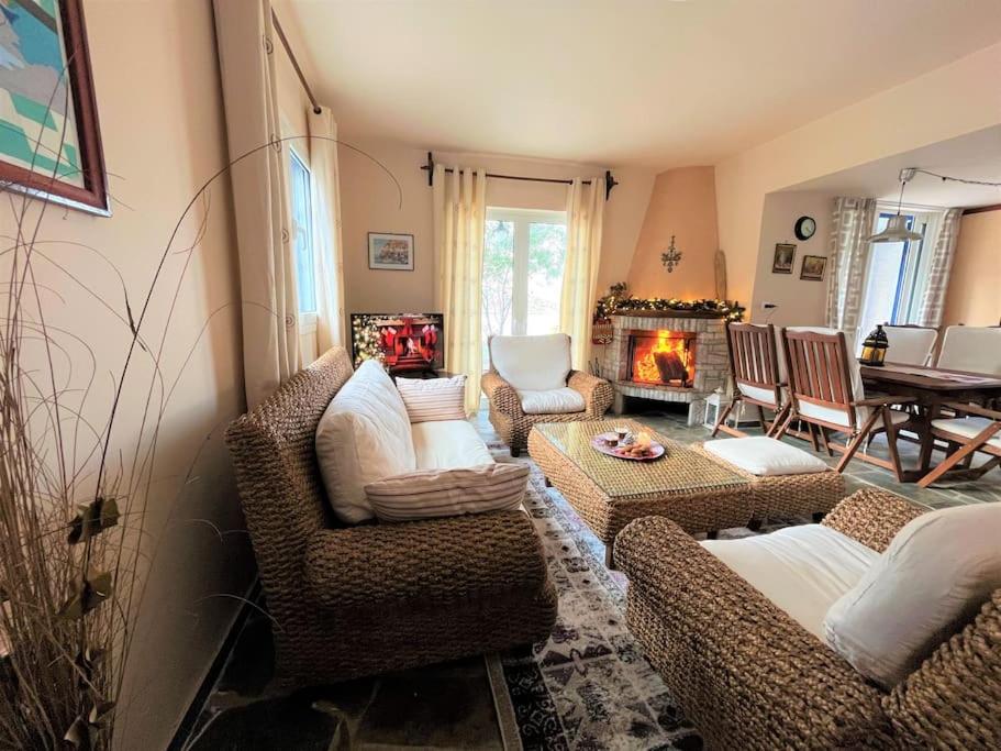 The villa features 4 bedrooms, 3 bathrooms, bed linen, towels, a flat-screen TV with streaming services, a dining area, a fully equipped kitchen, and a terrace with sea views. The comfortable, air-conditioned accommodation also comes with soundproofing and a fireplace. The property has an outdoor dining area.