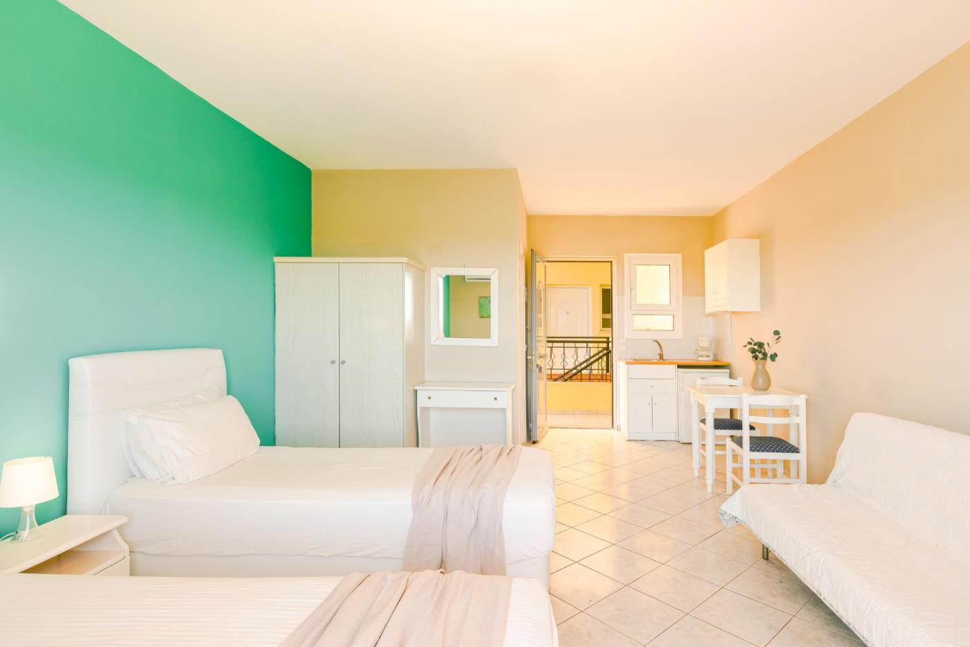 Studio with Sofa Bed. The studio has a private bathroom, air conditioning, a minibar, as well as a seating area with a flat-screen TV. A kitchenette fitted with a stovetop and kitchenware is available for cooking and storing food. This studio features a wardrobe, an electric kettle, a TV and a balcony. The unit has 3 beds.